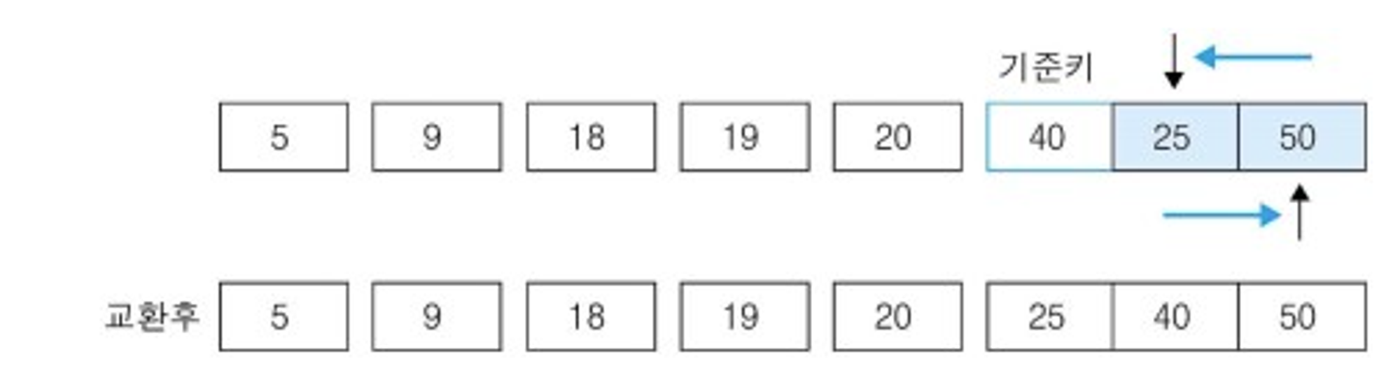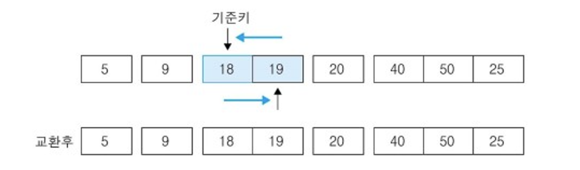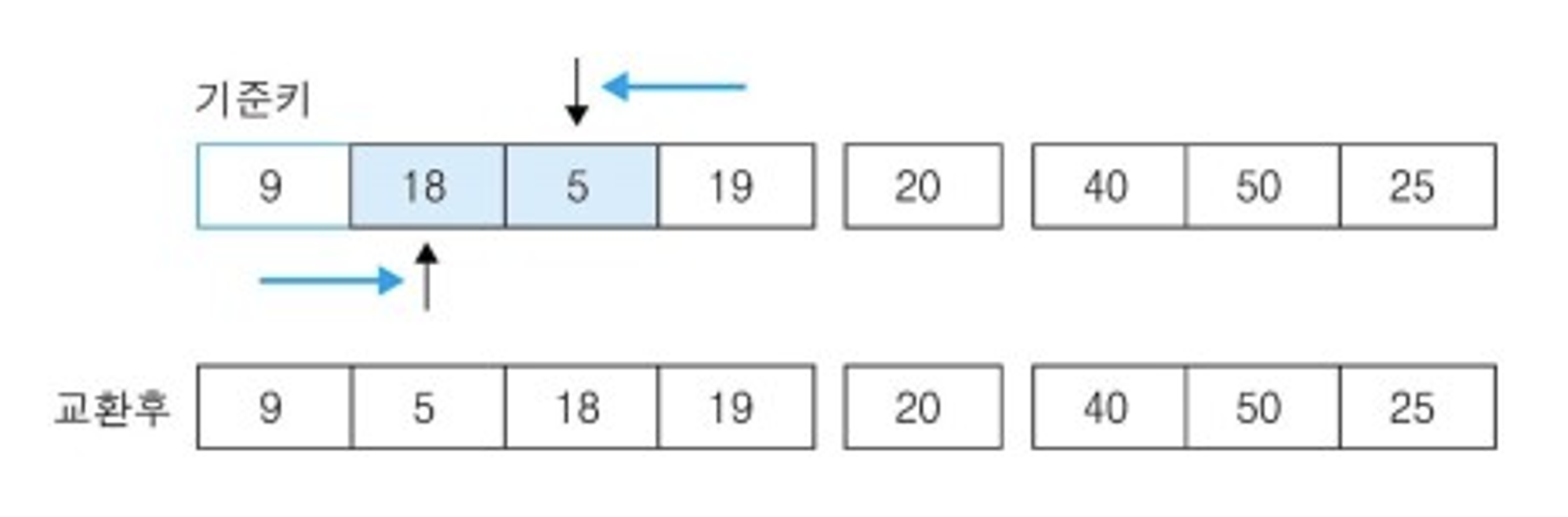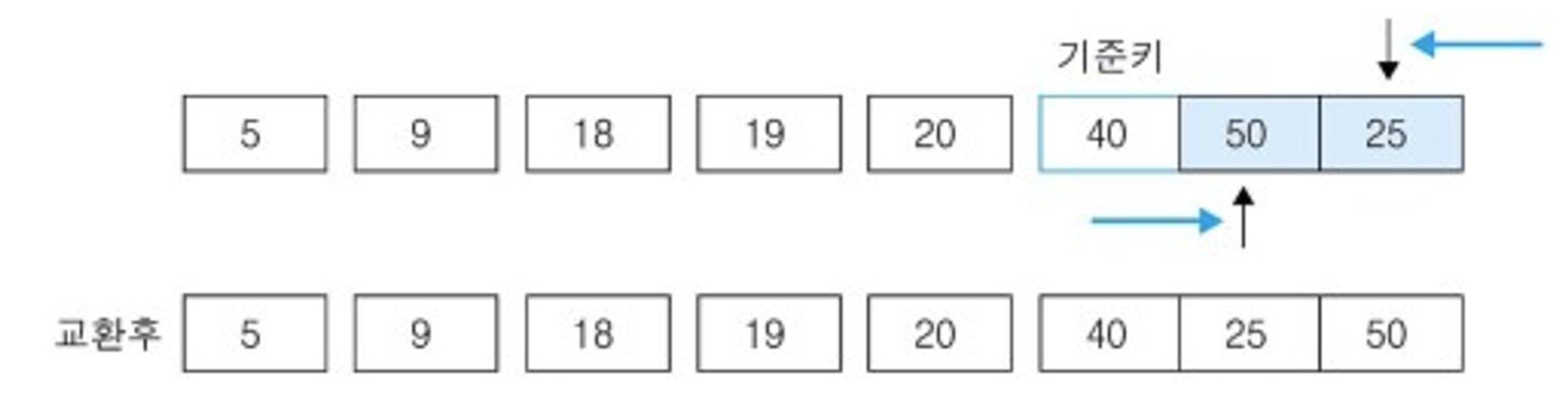 - ⑩ 이제 {40, 50, 25}에 대해 동작하게 되어 기준키 40보다 큰 50과 작은 25를 선택한다. 그리고 이 두 수를 교환한다.