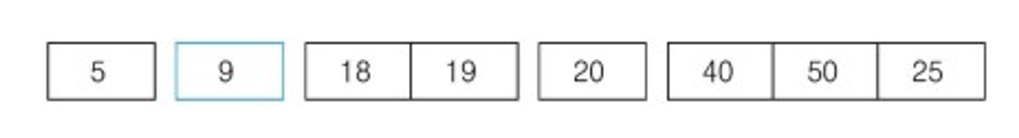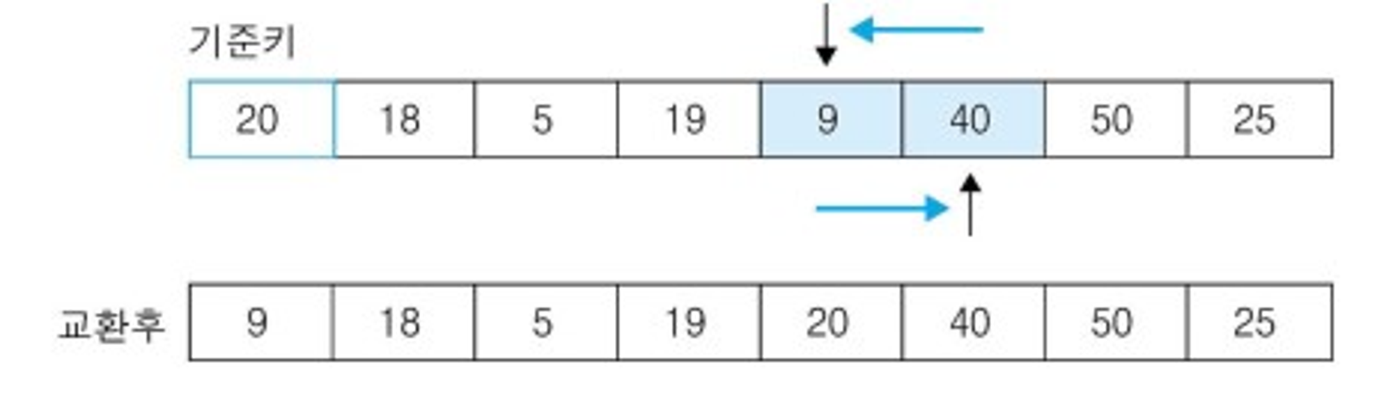 - ③ 마찬가지로 진행하여 기준키보다 큰 데이터인 40과 기준키보다 작은 데이터인 9를 선택한다. 그런데 발견된 위치가 서로 교차하는데, 이런 경우에는 두 값을 교환하지 않고 기준키 20과 작은 데이터인 9를 교환한다. 또한 기준키보다 큰 데이터를 발견하지 못하는 경우에도 기준키와 작은 데이터를 교환한다.