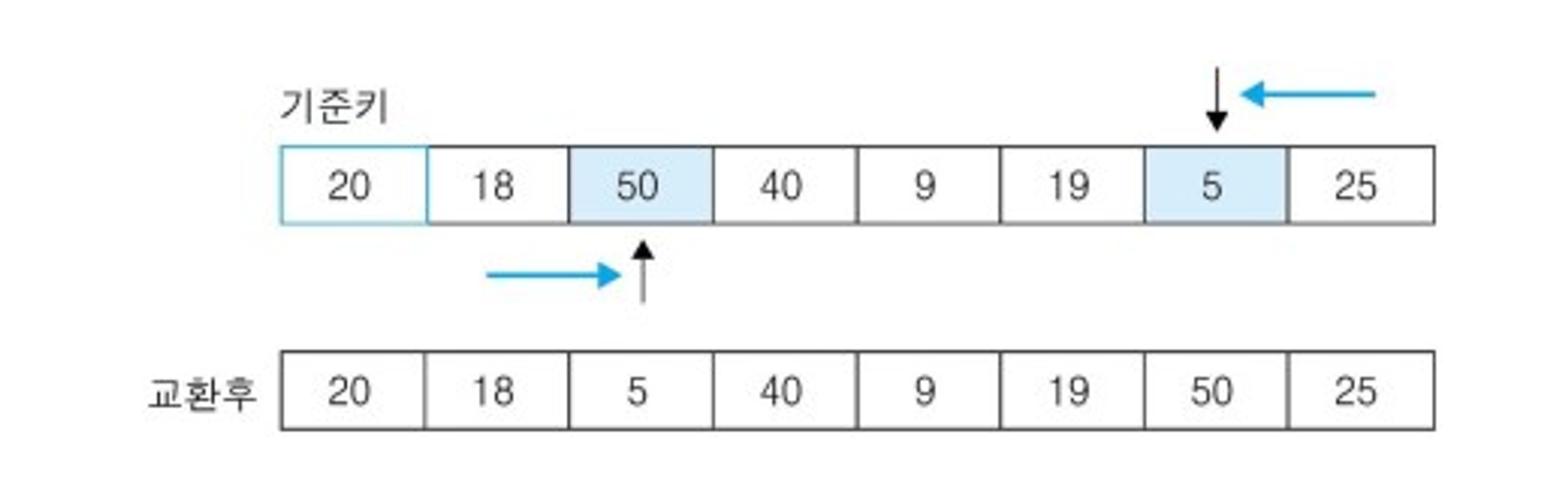 - ① 맨 앞의 20을 기준키로 하고, 기준키 다음부터 기준키보다 큰 데이터를 찾아 50을 선택하고, 마지막 데이터부터 기준키보다 작은 데이터를 찾아 5를 선택한다. 그리고 선택된 50과 5를 교환한다.