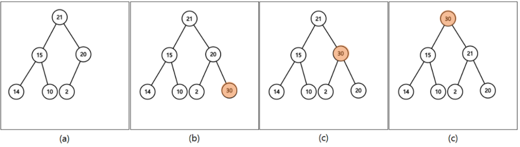 30을 제일 끝에 삽입 → 부모인 20과 비교하여 스왑 → 부모인 21과 비교하여 스왑 → 최대힙이 만들어졌으므로 삽입 종료
