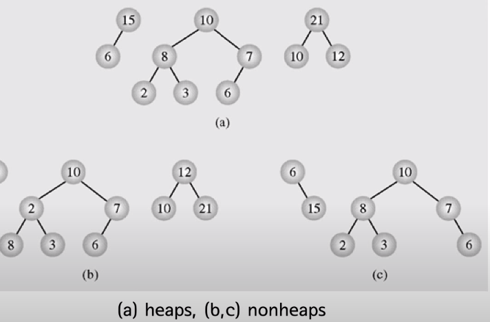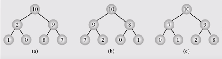 (a)는 3가지 모두 다 완전이진트리와 최대 힙의 특성을 만족한다.