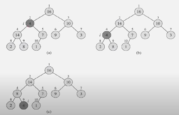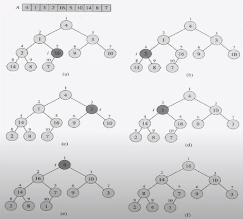 (e) 마지막 순서는 인덱스 1(루트노드)이다. 4 < 16 이므로 인덱스 1과 인덱스 2의 값을 바꾸면 인덱스2의 값은 4이다. 4 < 14 이므로 인덱스 2와 인덱스 4의 값을 바꾼다. 그리고 4 < 8 이므로 인덱스 4와 인덱스 9의 값을 바꾼 그림이 (f)이다.