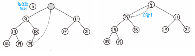 최소값(root) 삭제 → 제일 끝에 있는 27을 루트에 삽입 → 자식 중 더 작은 값인 9보다 27이 크므로 9와 27을 스왑 → 자식 중 더 작은 값인 14보다 27이 더 크므로 14와 27 스왑 → 자식 중 더 작은 값인 17보다 27이 더 크므로 27과 17 스왑 → 최소힙이 완성되었으므로 종료
