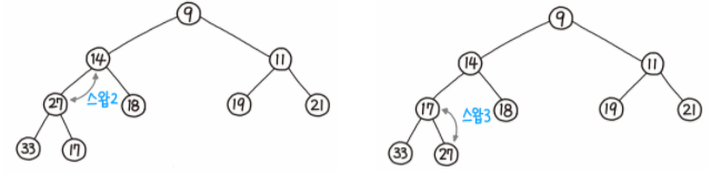 (b) 그 다음 인덱스인 4로 넘어간다. 자식 두 노드는 리프노드이므로 완전이진트리를 만족한다. 하지만 자신의 값인 2보다 자식노드 8, 9 중 더 큰 값인 14(인덱스 8)가 더 크므로 인덱스4와 인덱스 8의 값을 바꾼다.